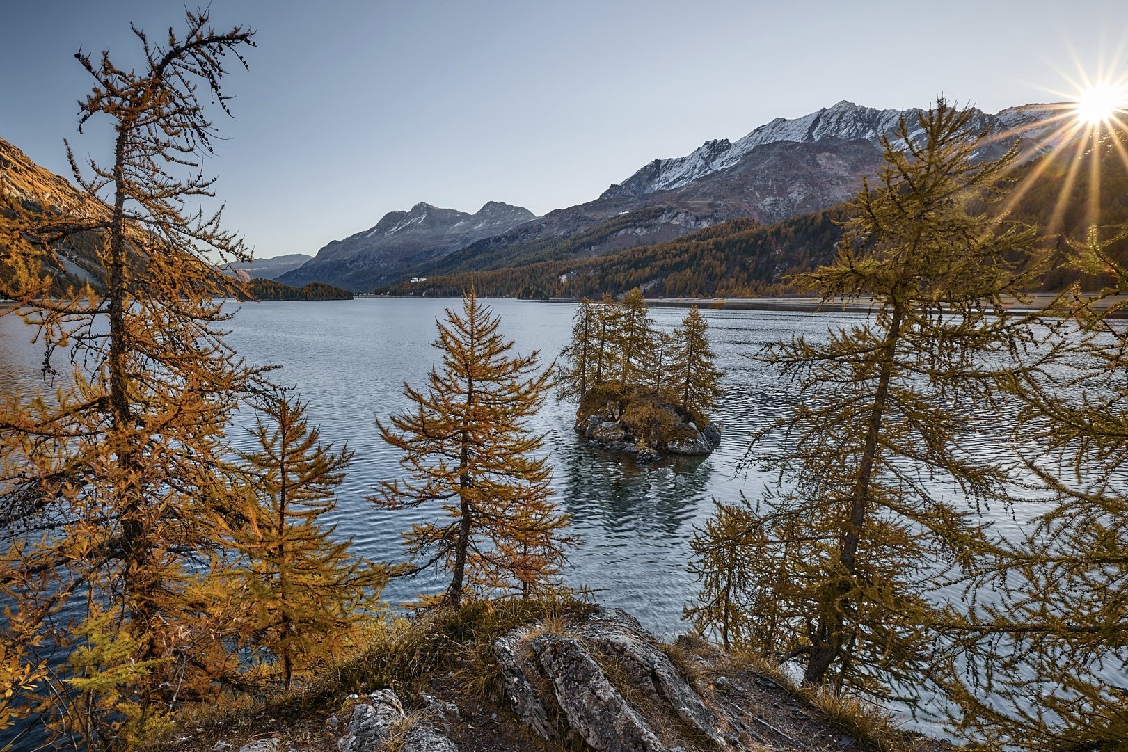 Berglandschaft im Herbst mit einem See, umgeben von Nadelbäumen und felsigen Bergen im Hintergrund. Im Vollbildmodus anzeigen